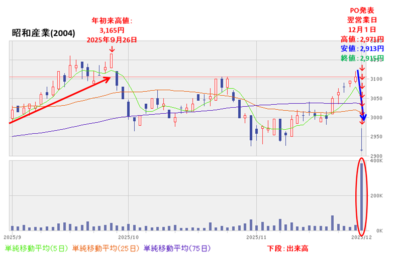 そして今回のPO発表の翌営業日(12/1)は、POによる短期的な需給悪化を懸念され、出来高を伴い窓を空けて前日比 190円安(-6.12%)と急落した。
