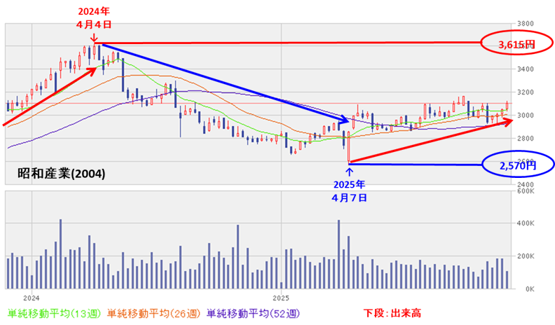 • 週足ベースの株価は、2024年4月に高値(3,615円)をつけるまでは上昇トレンドで推移していたが、