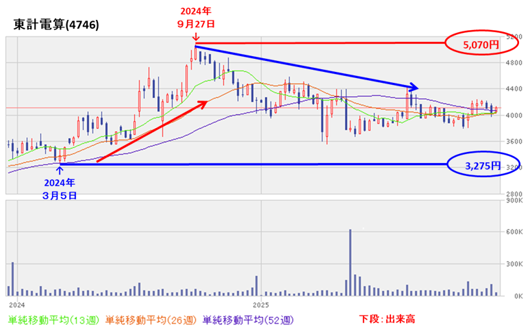 - 週足ベースの株価は、2024年3月に安値(3,275円)をつけた後は、高値切り上げ安値切り上げの上昇基調で推移し、同年9月に高値(5,070円)をつけた。