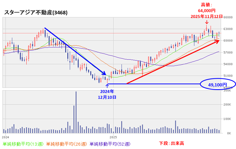 その後は高値切り上げ安値切り上げの上昇トレンドで推移し、翌年11月に高値(64,000円)をつけています。