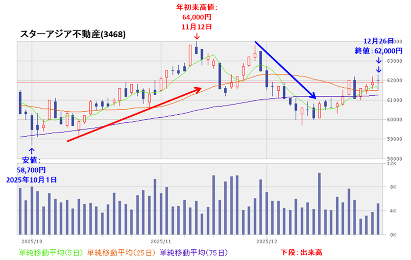 10月初旬に安値(58,700円)をつけた後は、高値切り上げ安値切り上げの上昇基調で推移し11月中旬に年初来高値(64,000円)をつけました。