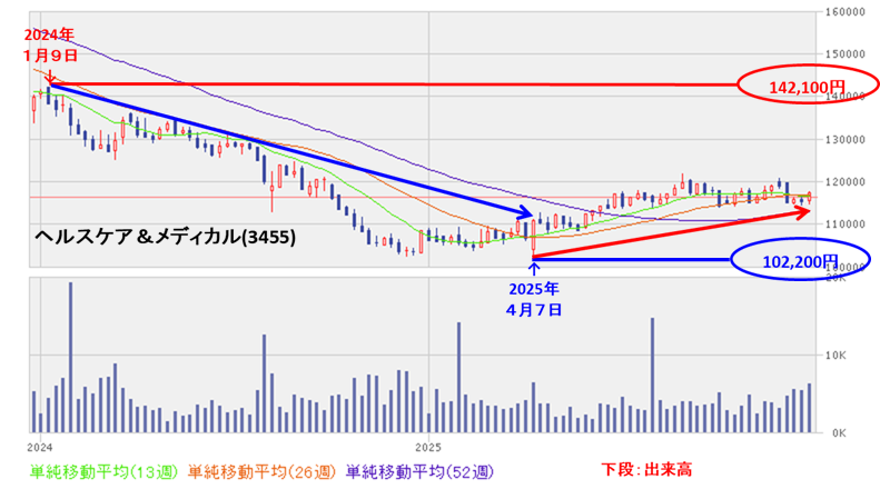 2024年1月に高値(142,100円)をつけた後は、高値切り下げ安値切り下げの下落トレンドで推移し、翌年4月に安値(102,200円)をつけました。