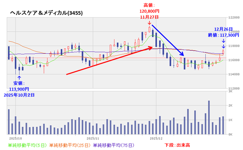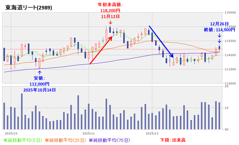 10月中旬に安値(112,000円)をつけた後は上昇基調で推移し、11月中旬に年初来高値(118,200円)をつけました。