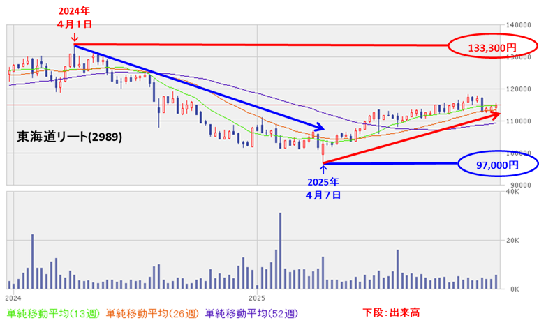 2024年4月に上場来高値(142,100円)をつけた後は、高値切り下げ安値切り下げの下落トレンドで推移し、翌年4月に上場来安値(97,000円)をつけました。