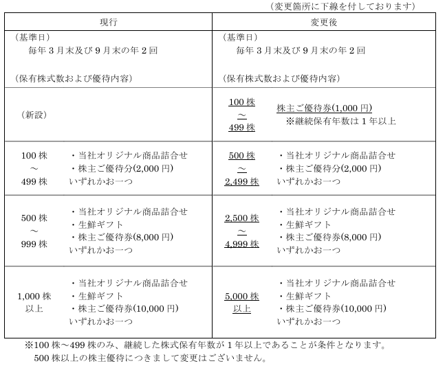 500株以上保有の場合は、継続保有の条件はなく、株数に応じて同社オリジナル商品詰合せ又は生鮮ギフト又は株主優待券のいずれか一つが進呈される。