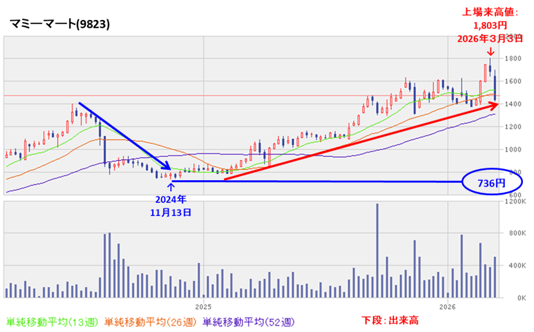 2026年3月に株式分割を考慮した実質上場来高値(1,803円)をつけています。