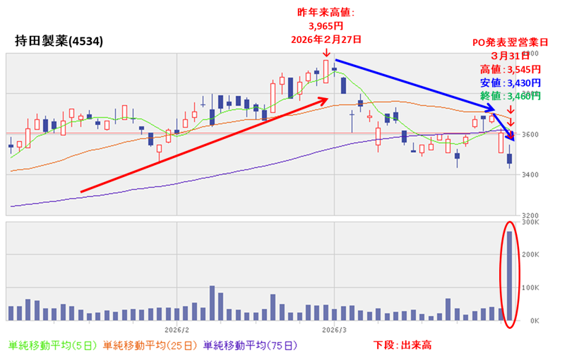 今回のPOと自社株買い発表の翌営業日(3/31)は、POによる短期的な需給悪化を懸念され、出来高を伴い前日比 145円安(-4.02%)と急落しました。
