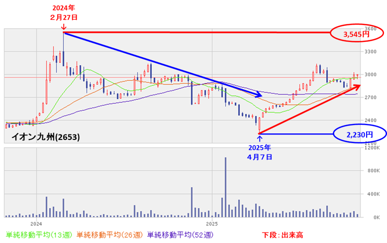 - 週足ベースの株価は、2024年2月に上場来高値(3,545円)をつけた後は、高値切り下げ安値切り下げの下落トレンドで推移し、翌年4月に安値(2,230円)をつけた。