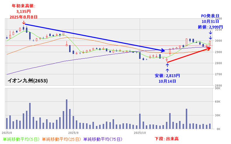 PO発表翌営業日(11/4)以降の株価は、POによる短期的な需給悪化懸念により、軟調な展開が予想されますが、