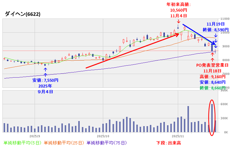 しかしその後は調整しており、今回のPO発表の翌営業日(11/18)は、POによる短期的な需給悪化を懸念され、出来高を伴い大きな陰線をつけ前日比 560円安(-6.07%)と急落しました。