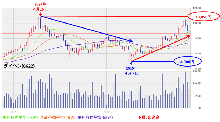 - 週足ベースの株価は、2024年4月に上場来高値(10,850円)をつけるまでは、上昇基調で推移していたが、