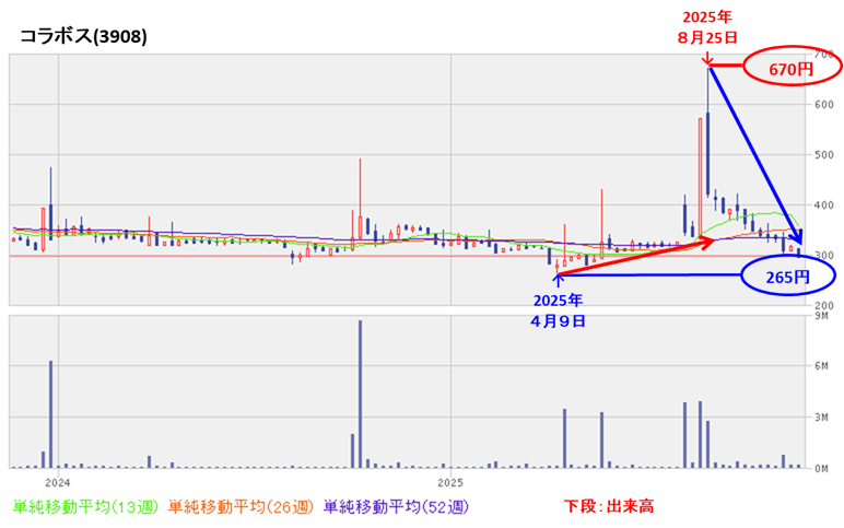 - 週足ベースの株価は、しばらく300~400円程度のレンジ内で推移していたが、2025年4月に上場来安値(265円)をつけた後は上昇基調で推移し、同年8月に急騰して高値(670円)をつけた。
