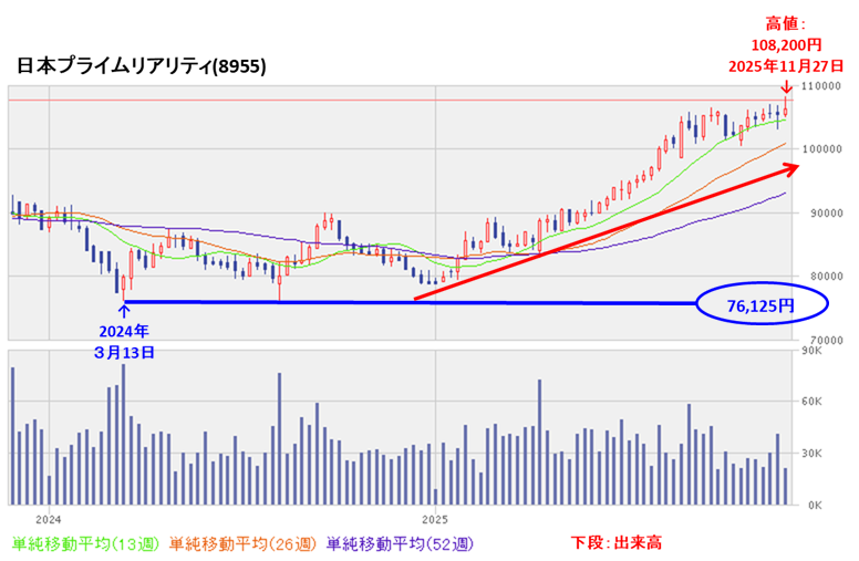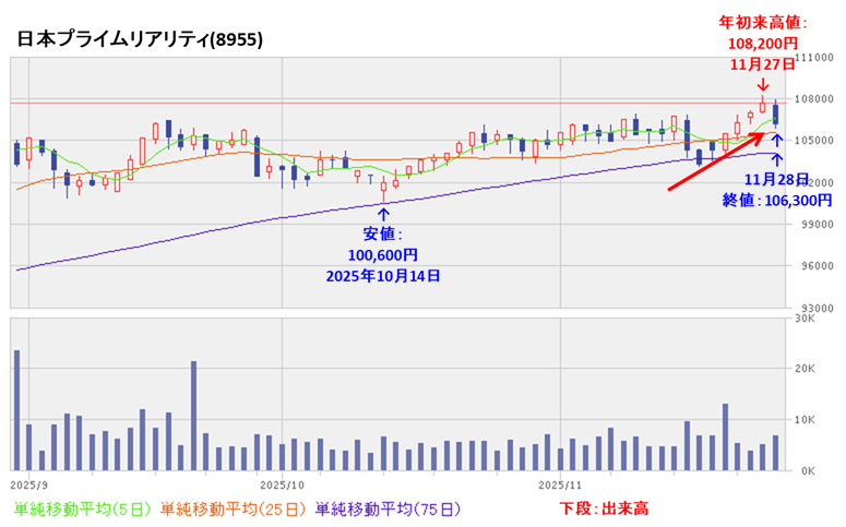10月中旬に安値(100,600円)をつけた後は上昇基調で推移し、11月下旬に年初来高値(108,200円)をつけています。