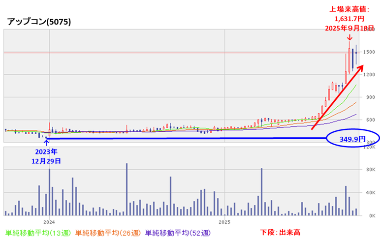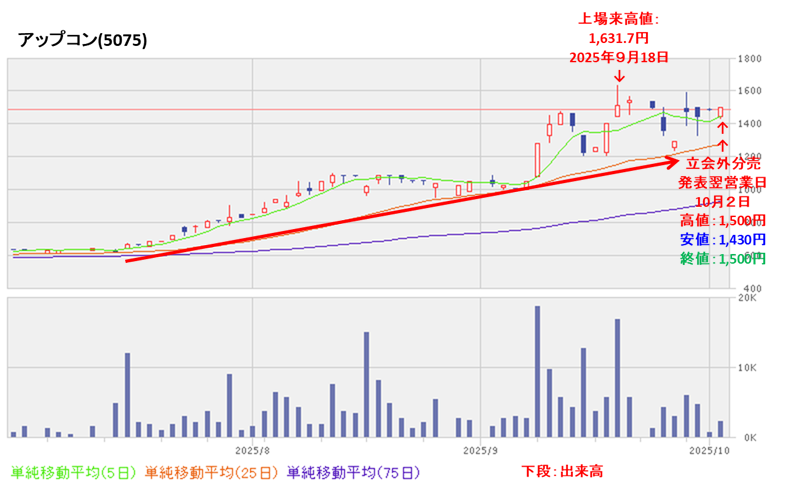 そして、2025年7月中旬頃から急上昇し、9月中旬に上場来高値(1631.7円:10/1付1/3分割後換算)をつけている。 - 直近の株価は、高値切り上げ安値切り上げの上昇基調で推移し、9/18に上場来高値(1,631.7円)をつけた。