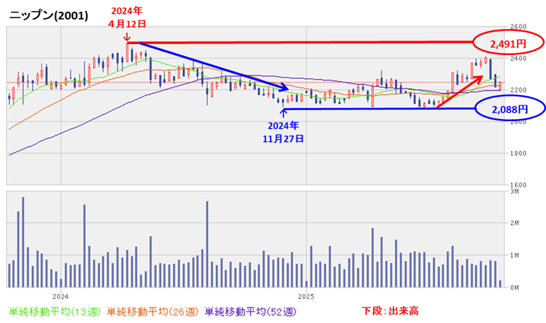 2024年4月に上場来高値(2,491円)をつけた後は、高値切り下げ安値切り下げの下落基調で推移し、同年11月に安値(2,088円)をつけました。