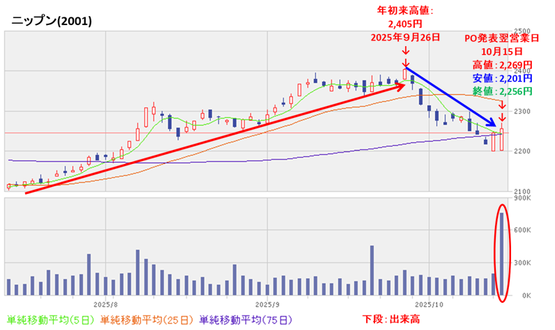 そして今回のPO発表の翌営業日(10/15)は、最初は安く始まったが、POによる短期的な需給悪化は見られず前日比 11円高(+0.49%)で終了した。