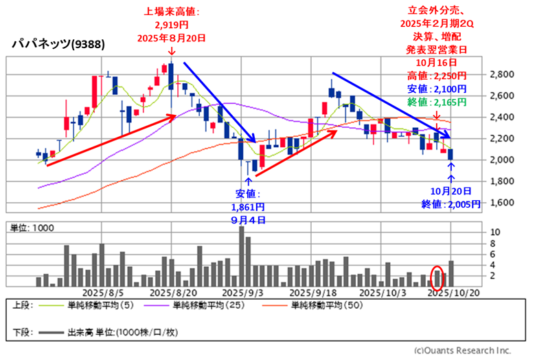 - 直近の出来高の5日平均は27.2百株、25日平均は29.3百株(10/20時点)で、流動性は低い水準。