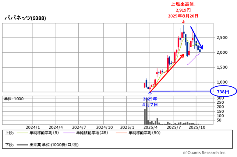 - 週足ベースの株価は、2025年3月に上場し、その翌月に上場来安値(738円)をつけた後は、高値切り上げ安値切り上げの上昇基調で推移し、同年8月に上場来高値(2,919円)をつけた。