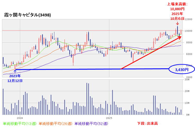 - 週足ベースの株価は、2023年12月に安値(3,430円)をつけた後は、高値切り上げ安値切り上げの上昇トレンドで推移し、2025年10月に上場来高値(10,880円)をつけている。
