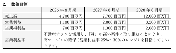 最終年度(2028年8月期)は、前期(2025年8月期)実績比で、売上高は4.7倍営業利益は5.2倍という高い目標を掲げている。