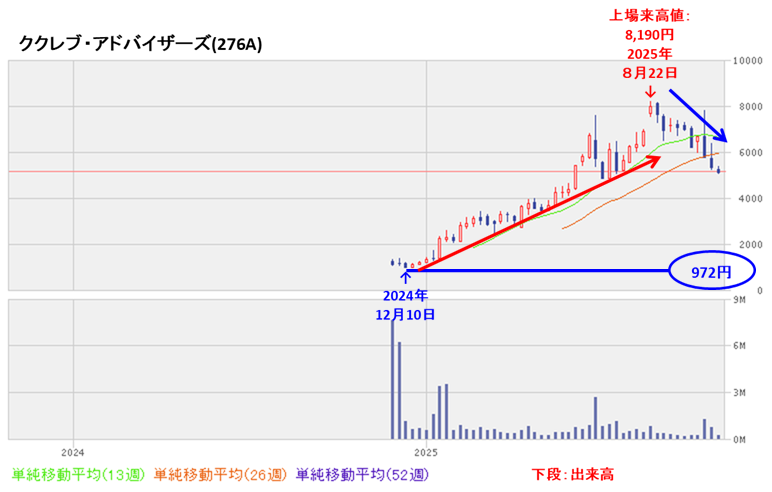 • 週足ベースの株価は、新規上場したばかりの2024年12月に上場来安値(972円)をつけた後は、高値切り上げ安値切り上げの上昇トレンドで推移し、翌年8月に上場来高値(8,190円)をつけた。