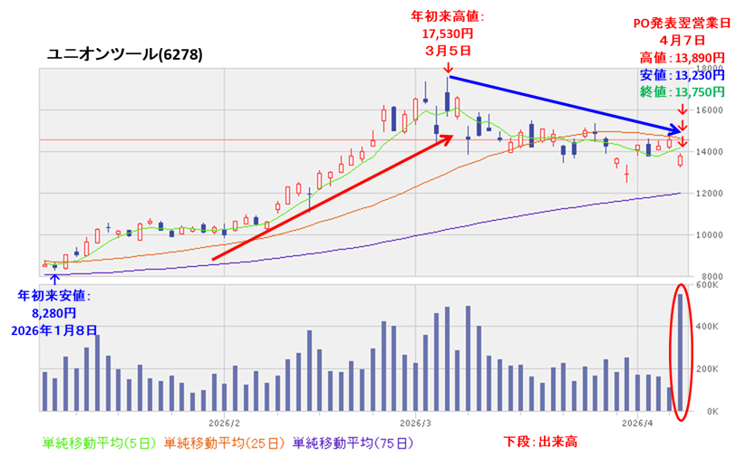 その後は調整しており、今回のPO発表の翌営業日(4/7)はPOによる1株利益の希薄化懸念により、窓を開けて出来高を伴い前日比810円安(-5.56%)と急落しました。