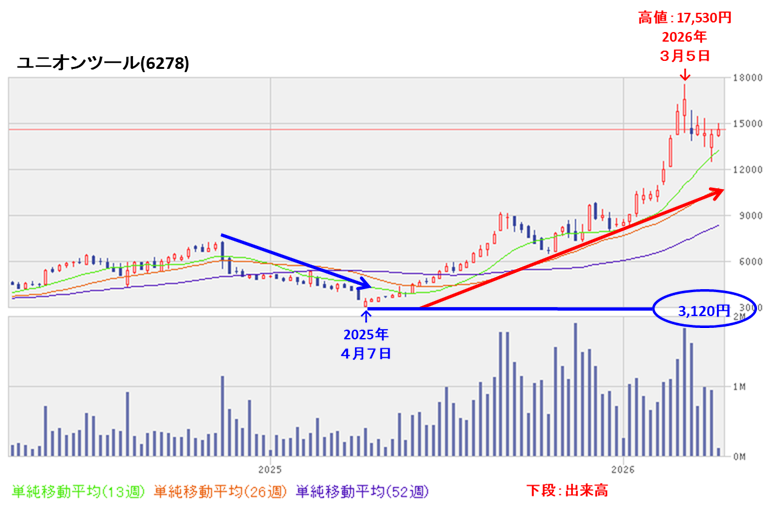 その後は、高値切り上げ安値切り上げの上昇トレンドで推移しており、翌年3月に高値(17,530円)をつけている。 - 直近の株価は、今年3月上旬に年初来高値(17,530円)をつけるまでは上昇基調で推移していたが、