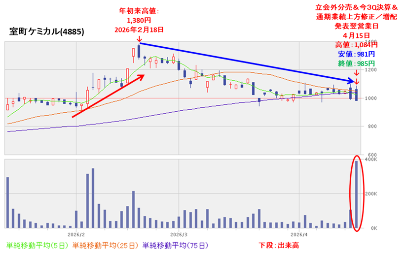 今回の立会外分売と今3Q決算、通期業績の上方修正/増配を発表した翌営業日(4/15)は、最初は高く始まりましたが、その後は大きめの陰線をつけて引けにかけて下落し、前日比 15円安(-1.50%)でした。