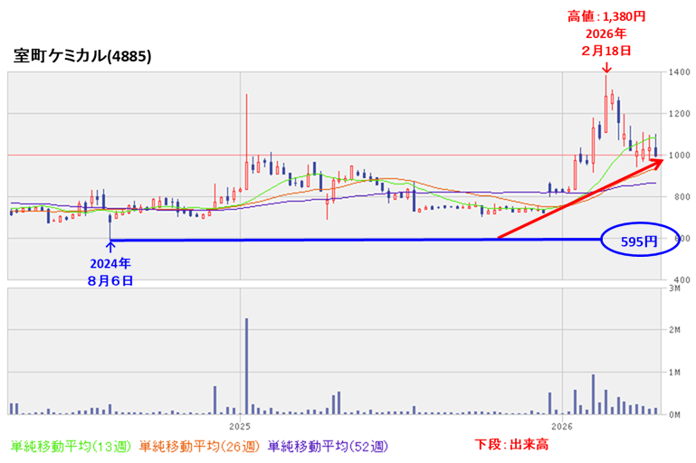 2026年に入り急騰しはじめ、同年2月に高値(1,380円)をつけています。