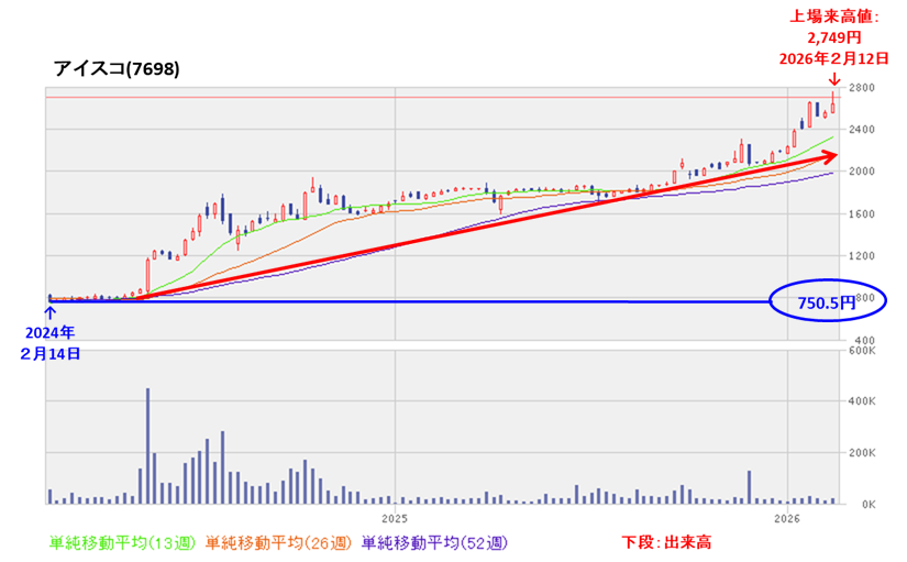 - 週足ベースの株価は、2024年2月に安値(750.5円)をつけた後は、長期間、高値切り上げ安値切り上げの上昇トレンドで推移し、2026年2月に上場来高値(2,749円)をつけている。