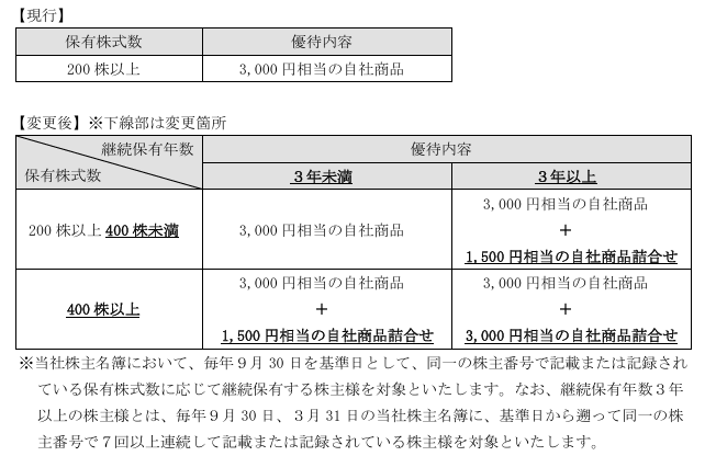 内容は表7のとおりで、現行の200株以上保有のみだったものを、400株以上保有を追加し、さらに3年以上の長期継続保有の場合は追加で自社商品詰合せが進呈されます。