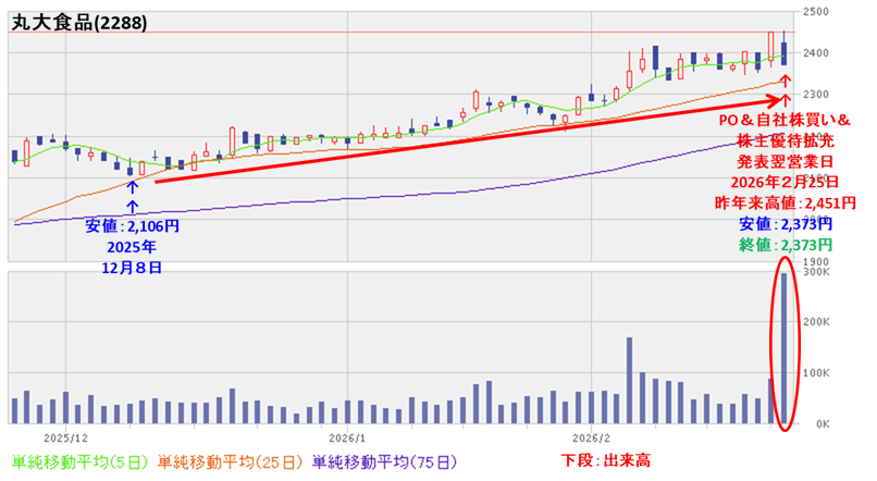 今回のPOと自社株買い、株主優待の拡充を発表した翌営業日(2/25)は、一旦は昨年来高値(2,451円)をつけましたが、その後が続かず、出来高を伴い前日比 76円安(-3.10%)と急落しました。