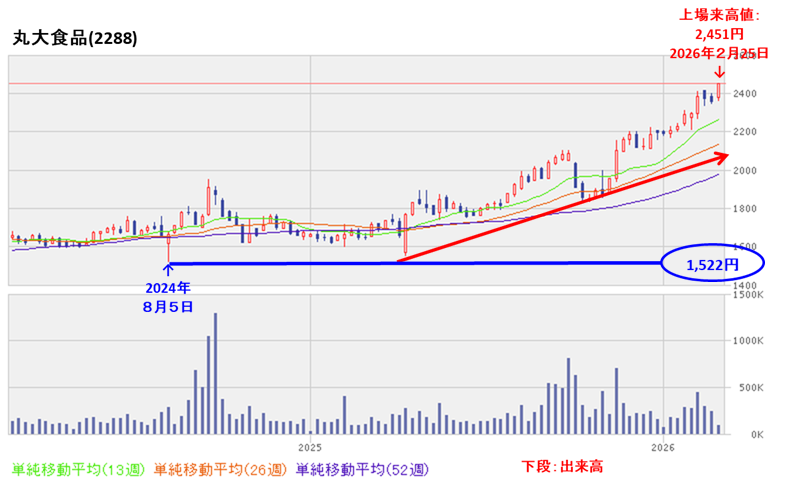 - 週足ベースの株価は、2024年8月に安値(1,522円)をつけたあとは、高値切り上げ安値切り上げの上昇トレンドで推移し、翌々年2月に高値(2,451円)をつけている。