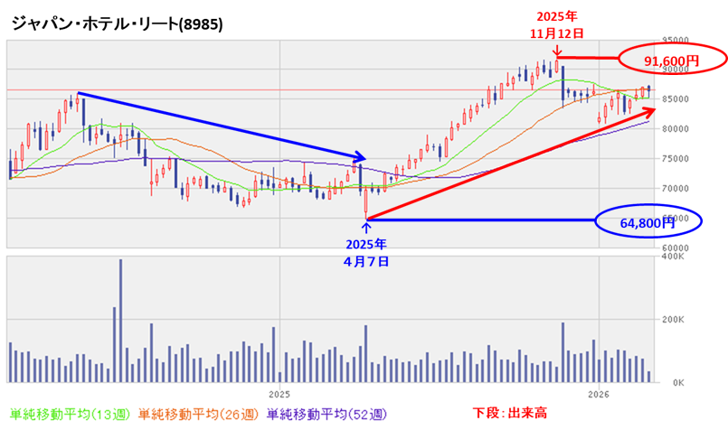 - 週足レベルの投資口価格は、2025年4月に安値(64,800円)をつけるまでは下落基調で推移したが、