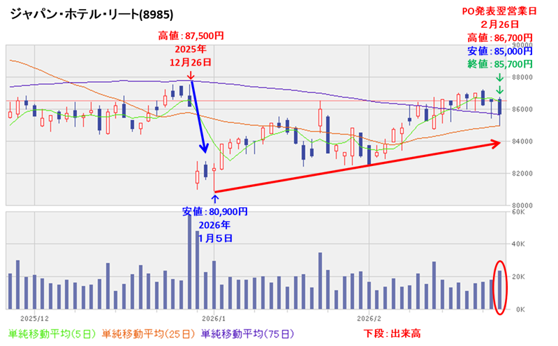そして今回のPO発表翌営業日(2/26)は、POによる1口当たり利益の希薄化懸念から、やや出来高を伴い前日比 800円安(-0.92%)と売られました。