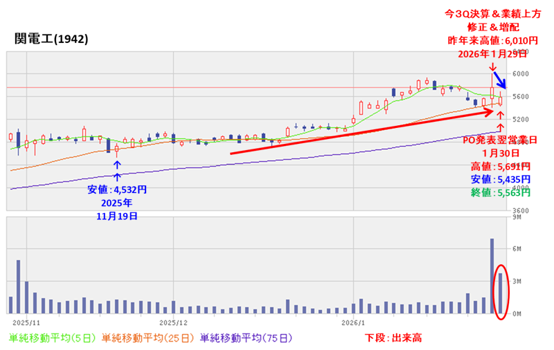 そして、今回のPOと自社株買い発表の翌営業日(1/30)は、POによる短期的な需給悪化懸念により、前日比 196円安(-3.40%)と下落した。 - 今後の株価は、25日移動平均線や75日移動平均線を割り込まず、勢いを保ち再び昨年来高値(6,010円)を更新していくのか、割り込んで下値模索をするのか要注目。