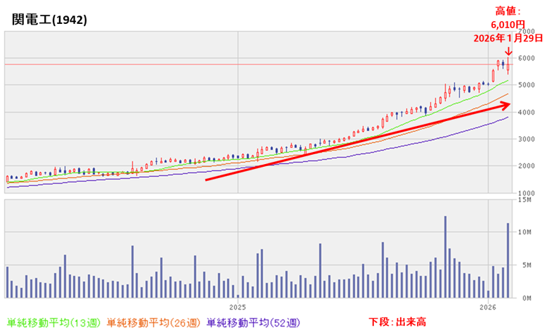 - 週足ベースの株価は、長期間、右肩上がりの上昇トレンドが継続しており、2026年1月に高値(6,010円)をつけている。