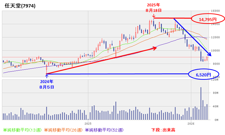 - 週足ベースの株価は、2024年8月に安値(6,520円)をつけた後は、高値切り上げ安値切り上げの上昇トレンドで推移し、翌年8月に株式分割後の実質上場来高値(14,795円)をつけた。