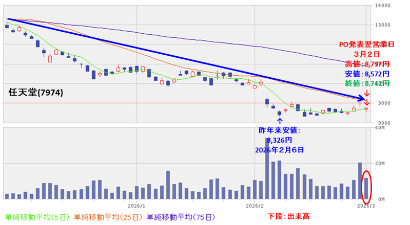 そして、今回のPOと自社株買い発表の翌営業日(3/2)は、地合いが悪かったこともありますが、POによる短期的な需給悪化を懸念され、前日比 253円安(-2.81%)と急落しました。