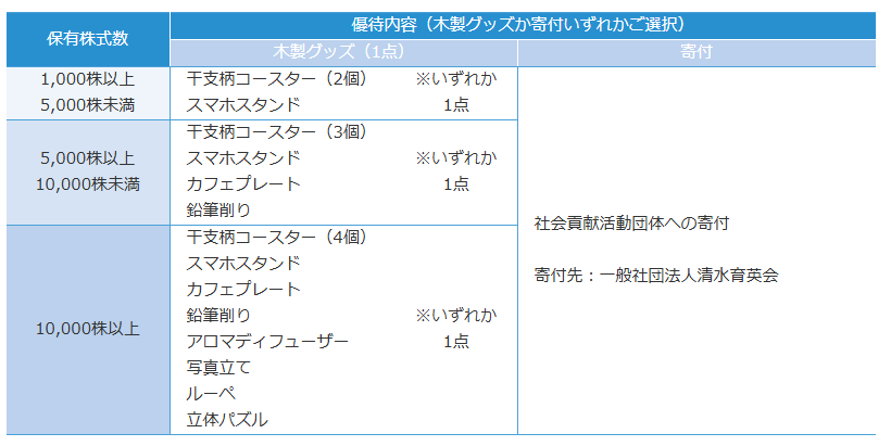 • 株主優待があり、毎年3月末に1,000株以上保有の株主は、保有株数に応じて、東京木工場の木製グッズ1点又は社会貢献活動団体への寄付が選択できる。