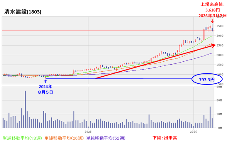 2026年3月に上場来高値(3,618円)をつけている。